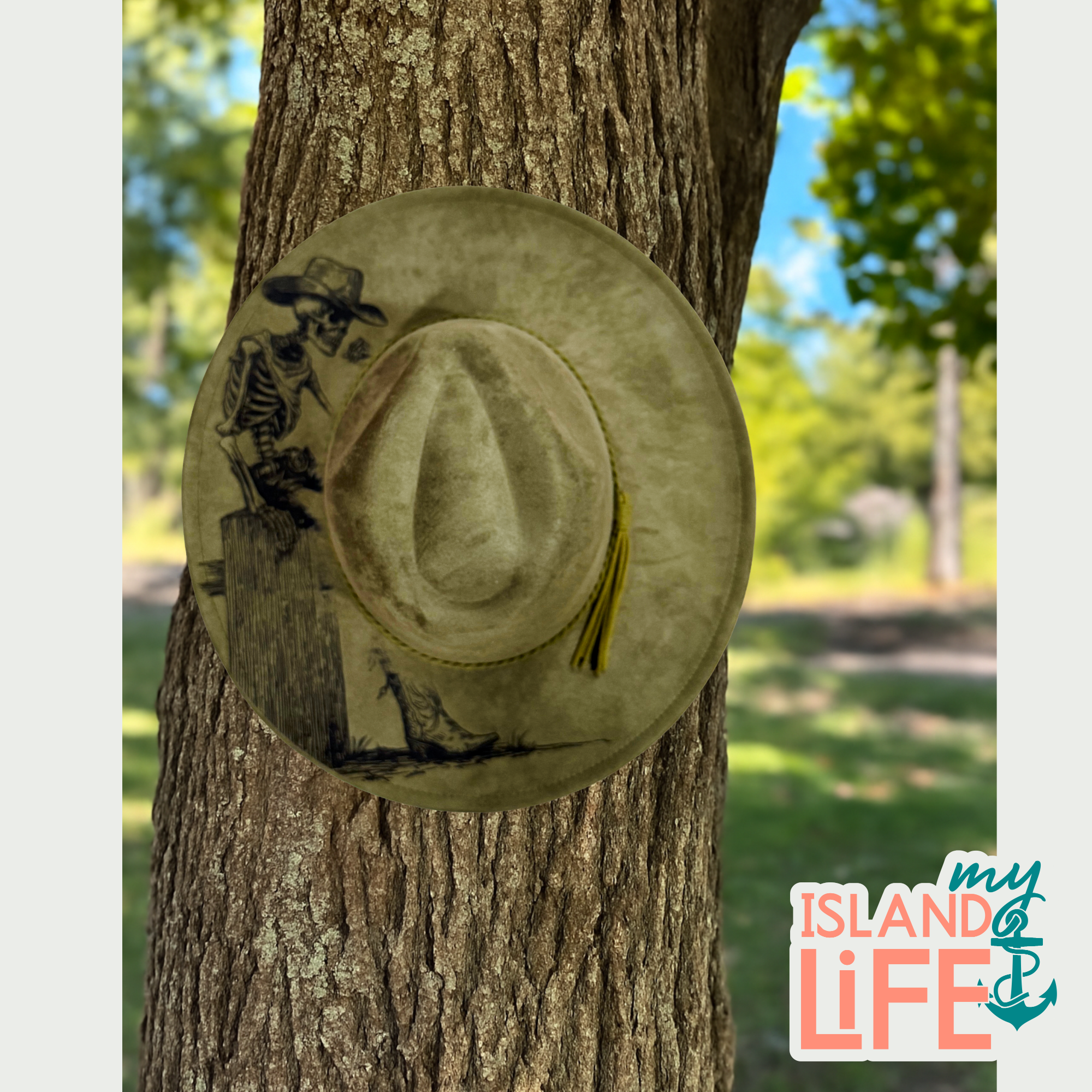 Dusty Bone (Skeleton Cowboy) Engraved Vegan Suede Hat – Wide Brim