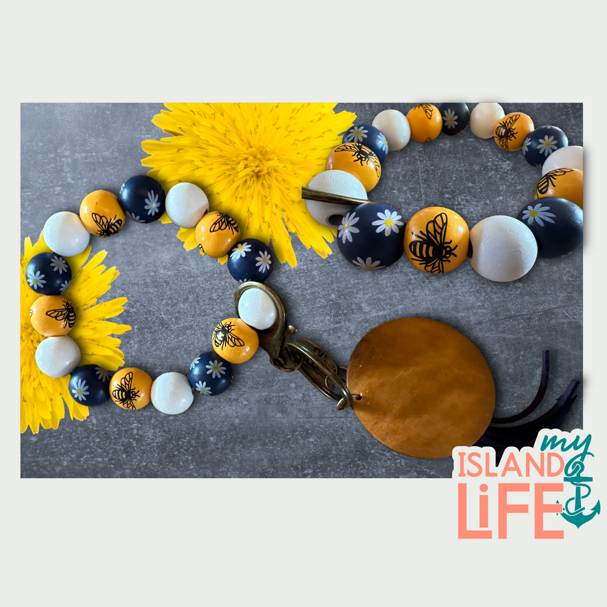 Carry your essentials with a buzz of style in the Bee Wristlet. Featuring a wooden disc that can be personalized. With a fun bee theme, this wristlet is perfect for anyone who wants to add a playful and quirky touch to their outfit. - a handy wooden wristlet for holding keys, fobs, or name tags.