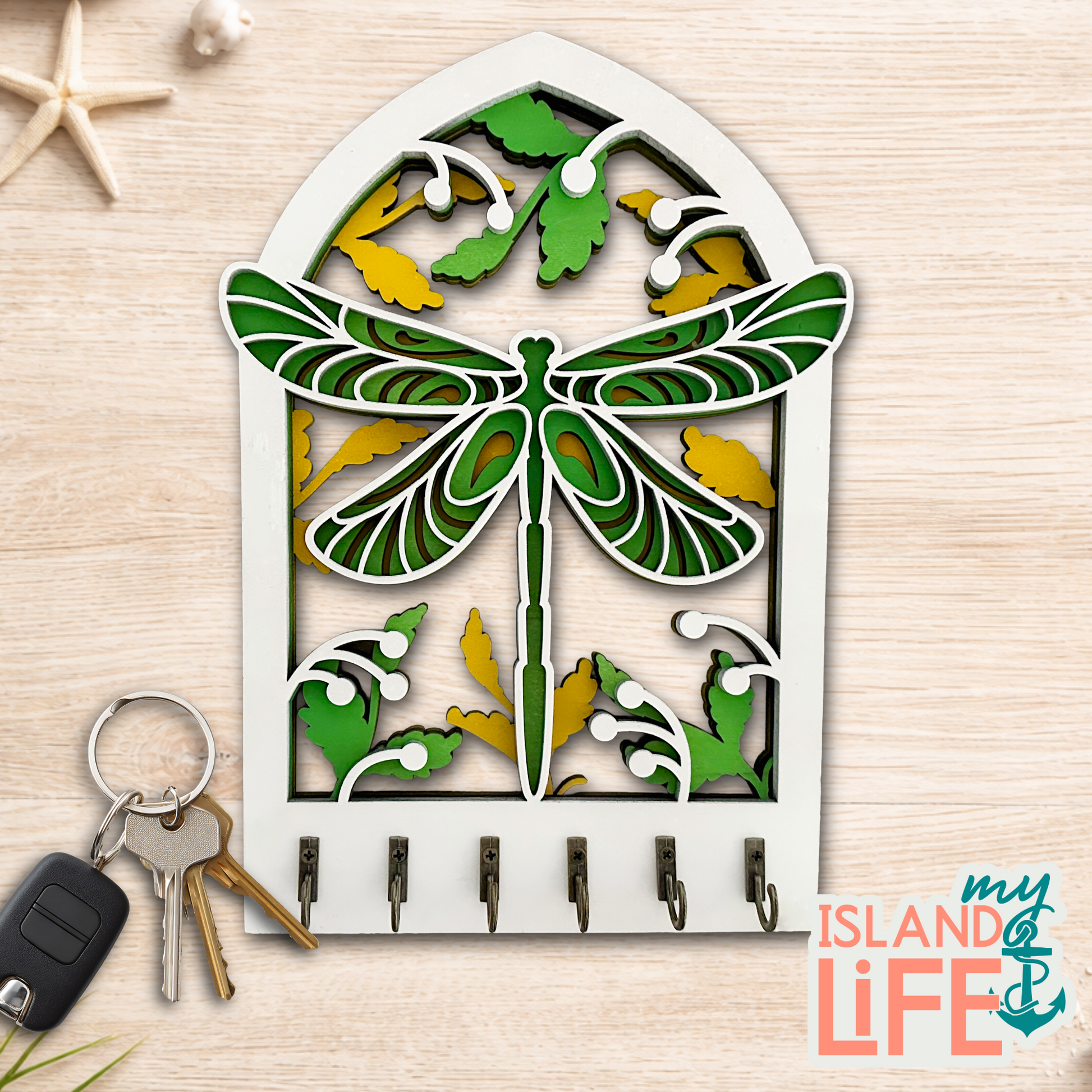Keep your keys organized in style with this handcrafted Dragonfly Arch Key Holder β featuring delicate dragonfly designs laser-engraved right here on the island.