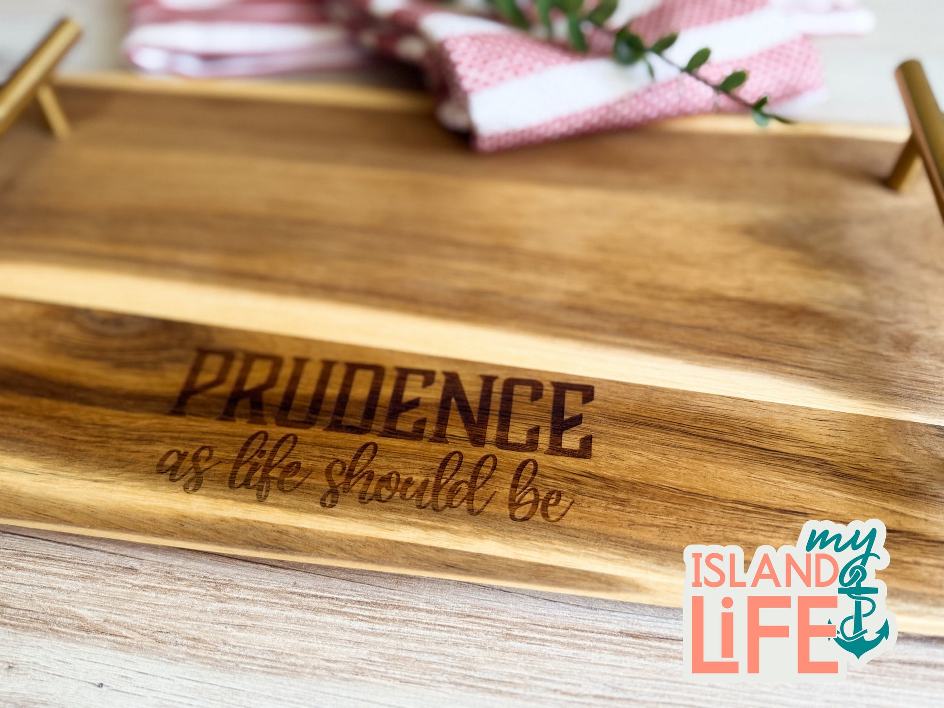 Bring a touch of island charm to your home with this beautifully engraved acacia serving tray. Featuring the phrase “Prudence, as life should be”, this piece is a reminder of the simple beauty and peaceful spirit of our island.