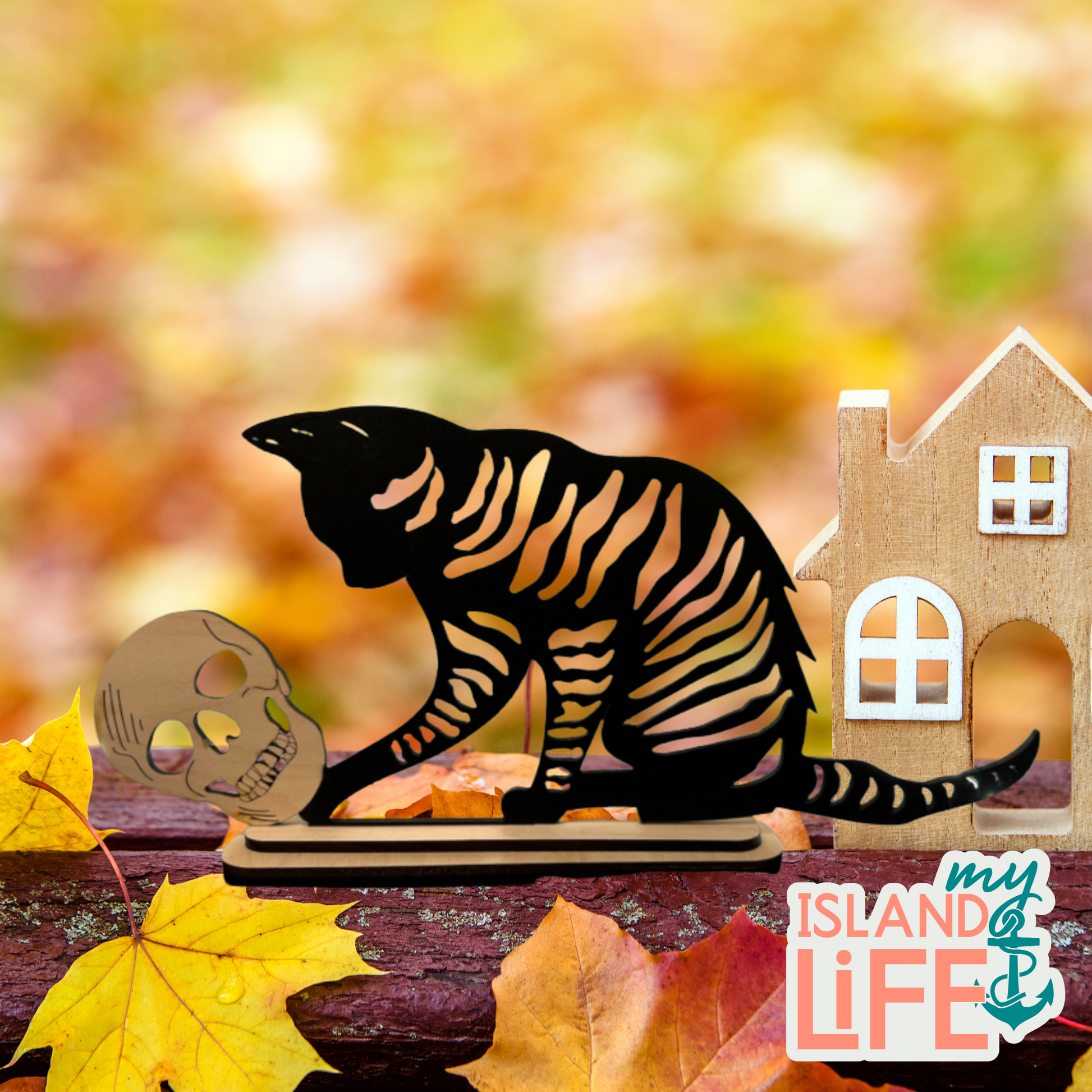 Mischievous and mysterious, the Skull Keeper Kitty is ready to pounce into your Halloween collection. This freestanding wooden cat features bold skeletal cut-outs and a skull detail that makes it both eerie and charming. A perfect piece for shelves, mantles, or entryway displays.